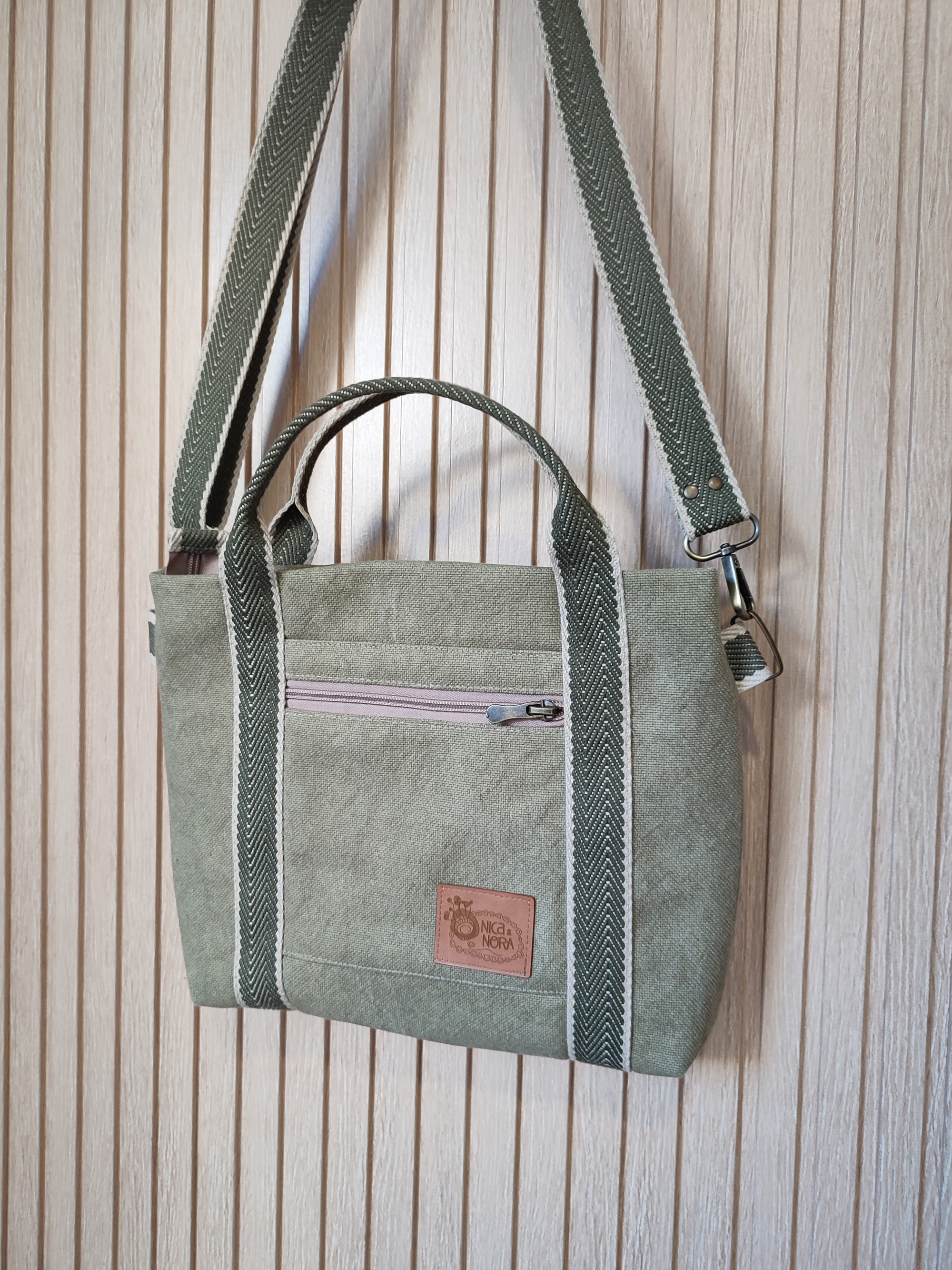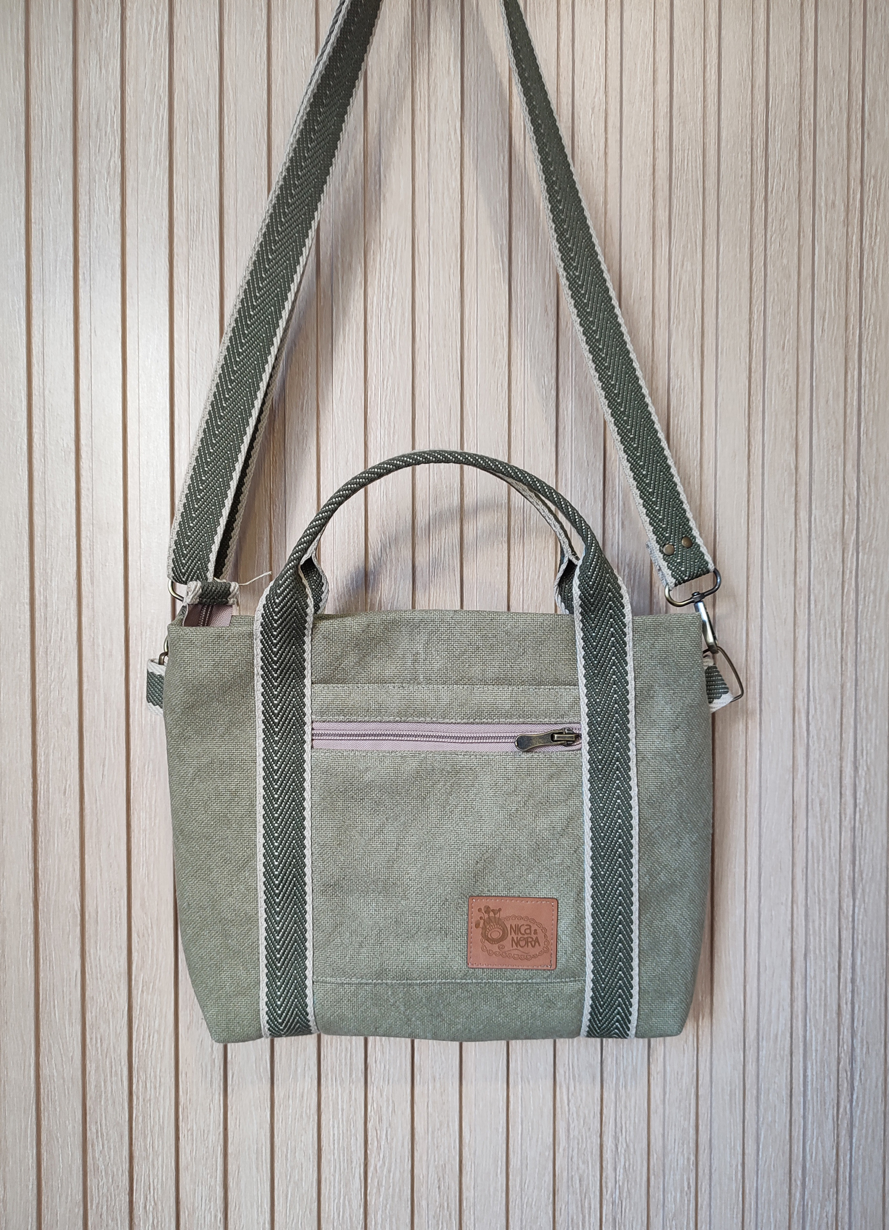 Bolso elaborado en nuestro propio taller artesanal con tejido de algodón reciclado en color verde. Tiene un bolsillo delantero con cremallera y el interior está cerrado también con cremallera. Las esas están elaboradas también con algodón reciclado.