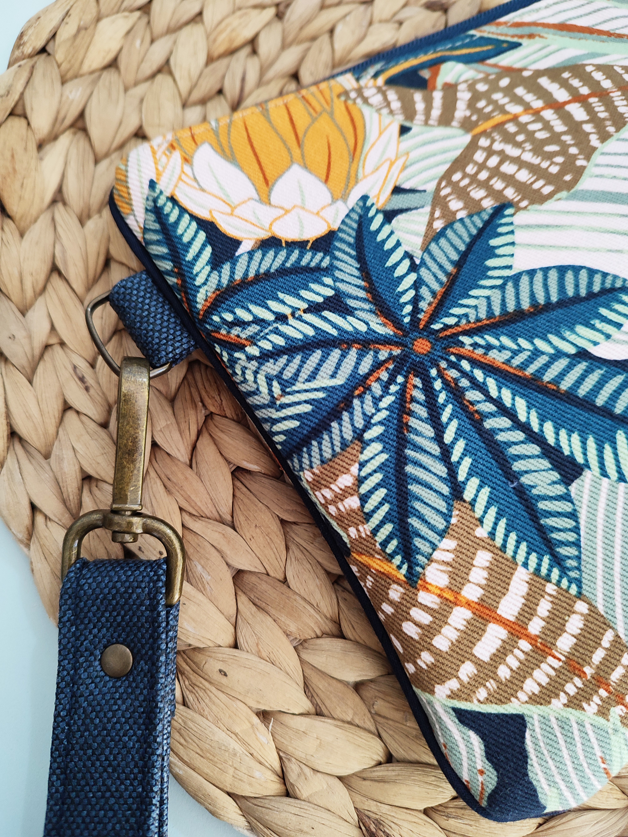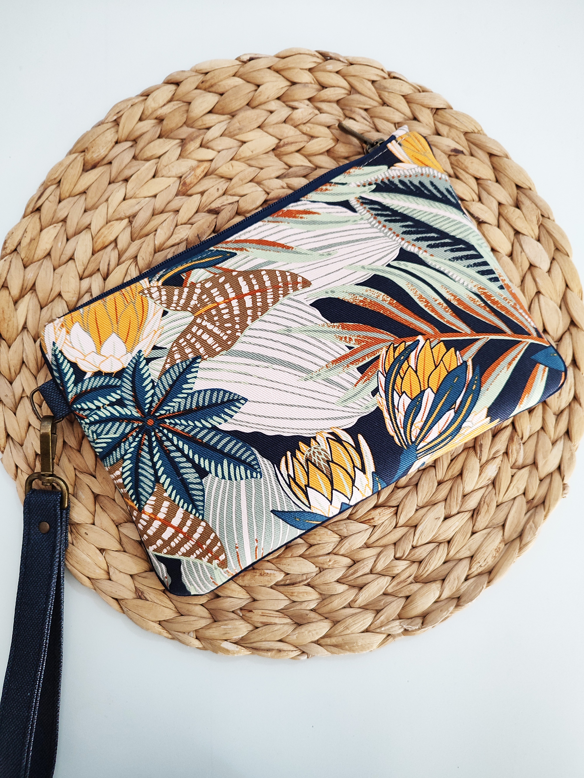 Cartera de mano diseñada y elaborada en nuestro taller artesanal, con tela de algodón estampada. Está cerrada con cremallera, el interior está forrado y tiene un bolsillo. El asa lateral está elaborada con tejido reciclado encerado en color azul marino.
